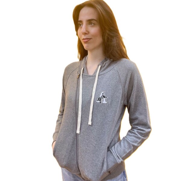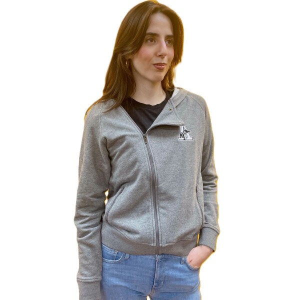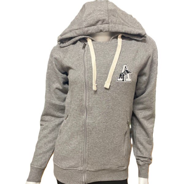 Gray hoodie featuring an embroidered West Point ‘Kicking Mule’ logo. With a slightly diagonal front zipper, this jacket features an 80's retro flair.